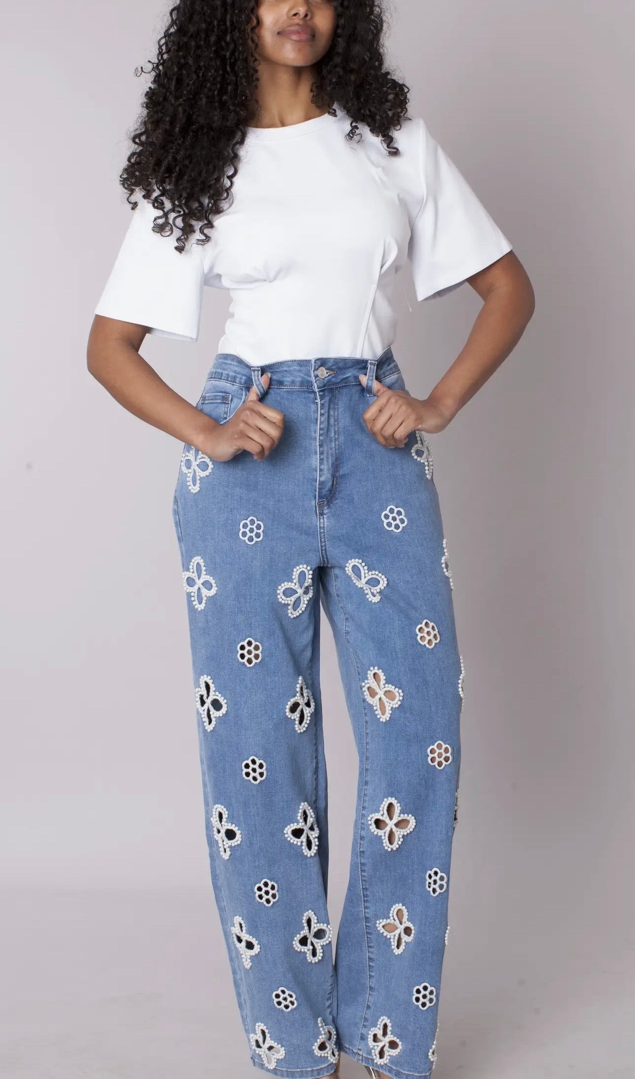 Make a statement in these trendy jeans for women featuring intricate floral cutout embellishments and a flattering wide-leg fit. These stylish denim jeans for women blend comfort and standout boutique fashion for an effortlessly elevated look.