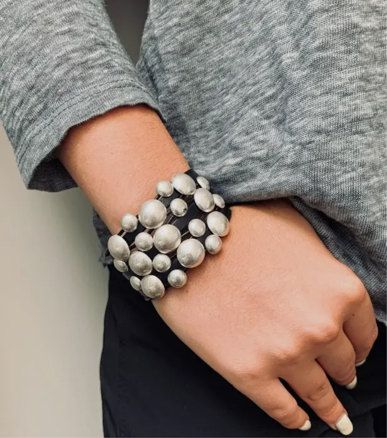 Multi-strand black leather silver or gold stud cluster magnet bracelet