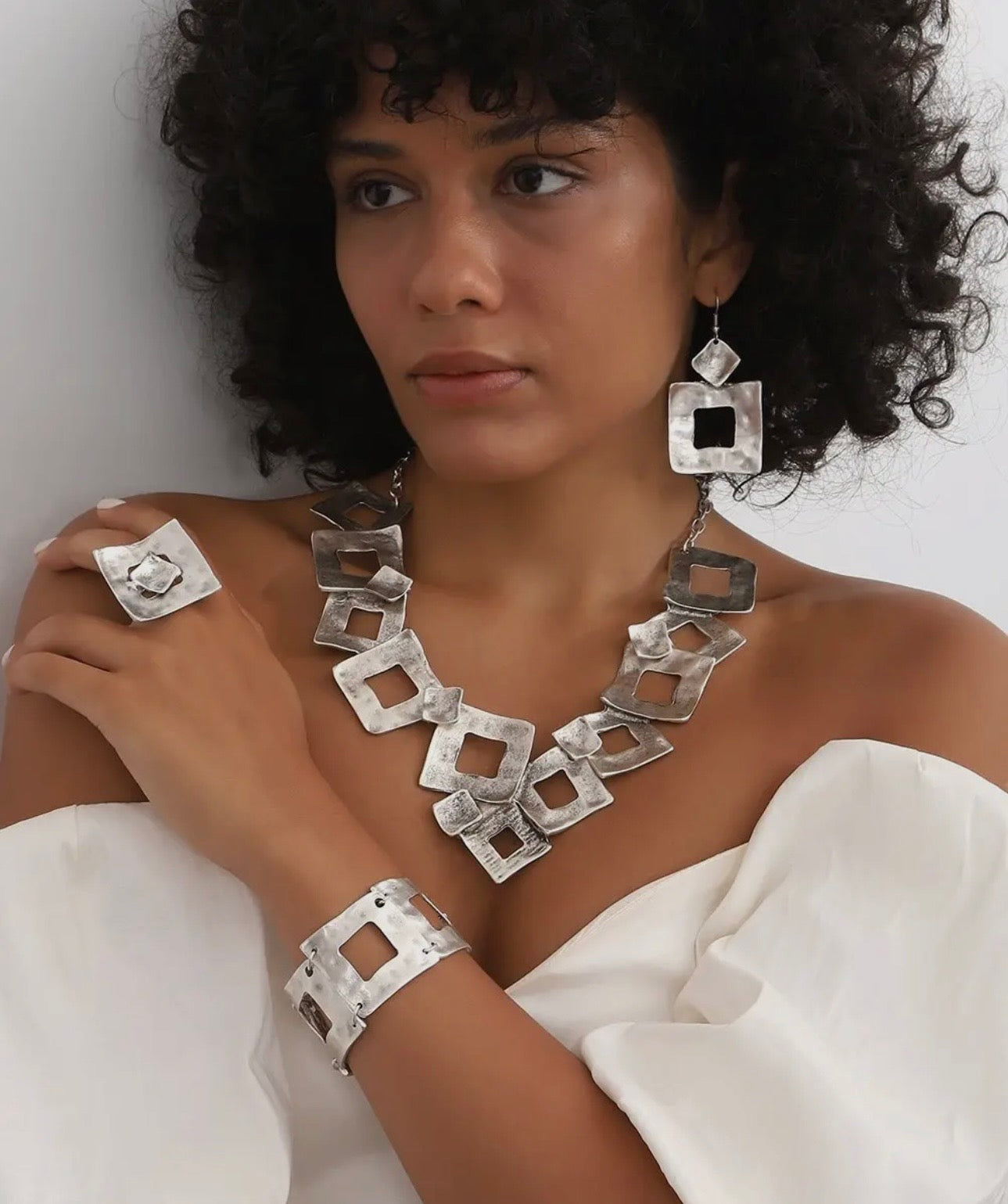 • Silver Plated Women Necklace, Bracelet, Earrings and Free Size Ring. Special Bohemian Design..