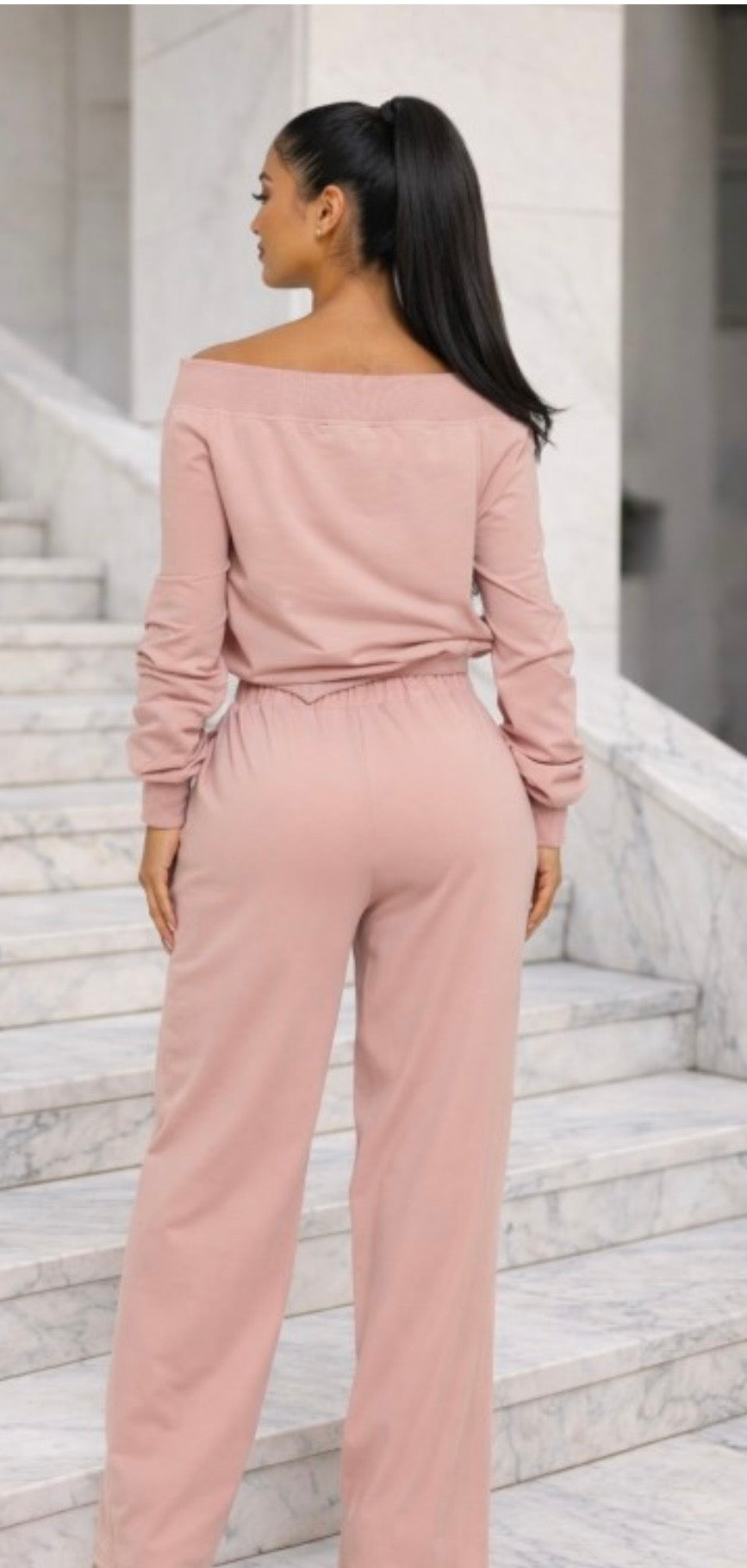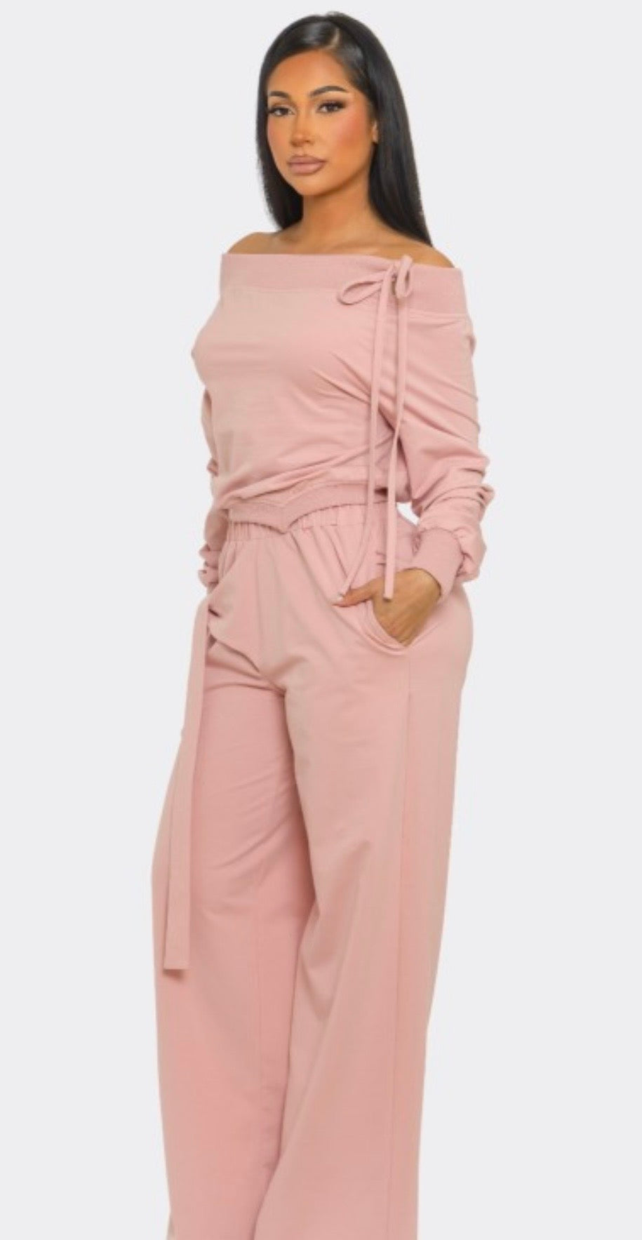 This off shoulder set features a relaxed long sleeve top with a wide neckline and adjustable tie detail, paired with matching high waist wide leg pants for a clean, elongated silhouette. The soft stretch fabric drapes smoothly while offering comfortable movement. Designed as a coordinated set, it delivers effortless polish that transitions easily from casual daytime wear to elevated evening styling.