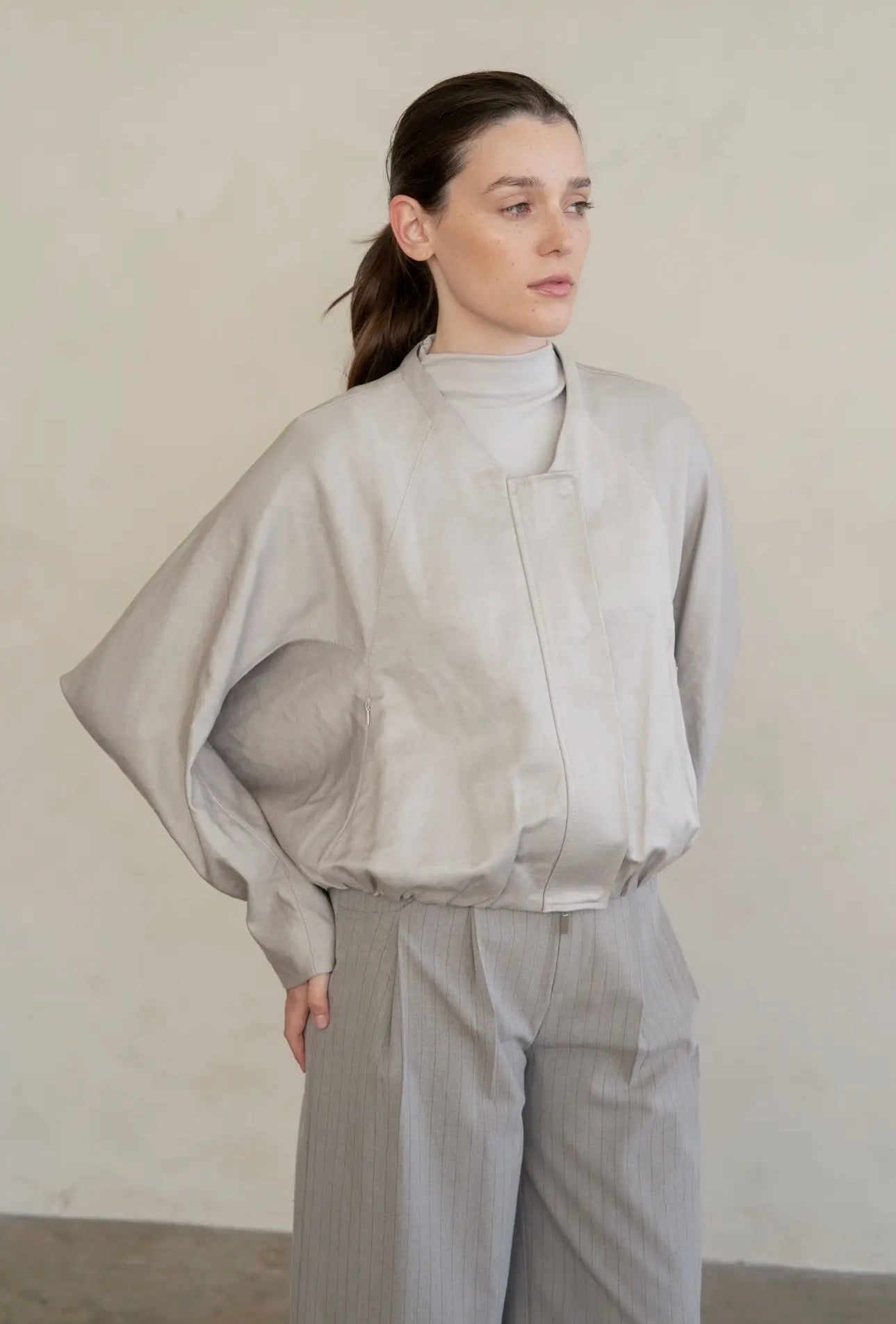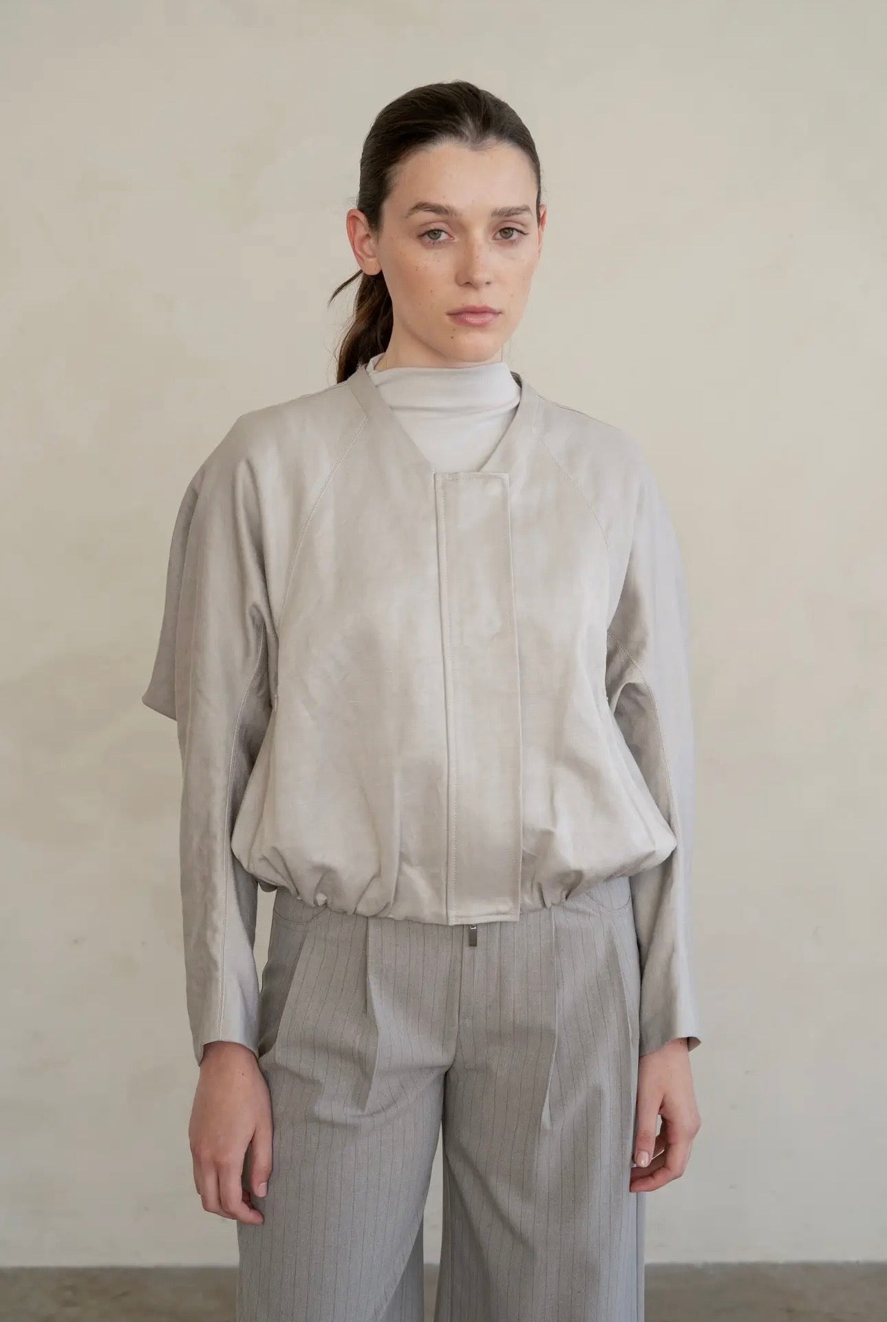 • Minimal collarless jacket with clean, modern silhouette