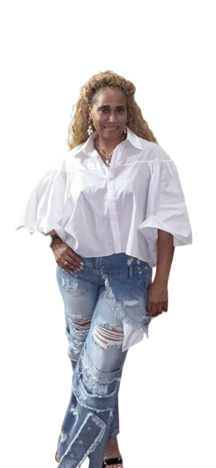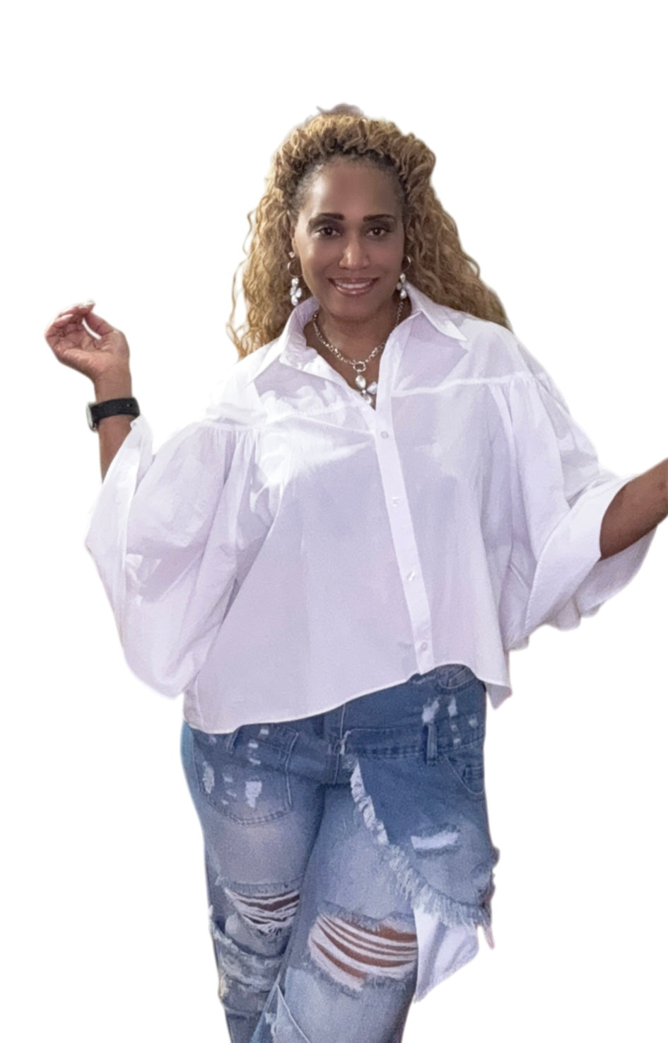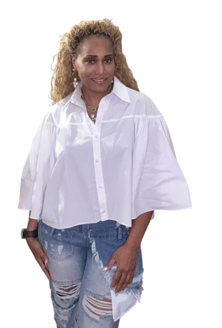 Playful and polished, this blouse is crafted from crisp cotton poplin in white. The flowy sleeves add movement and a touch of femininity, while the relaxed fit keeps it effortlessly wearable.