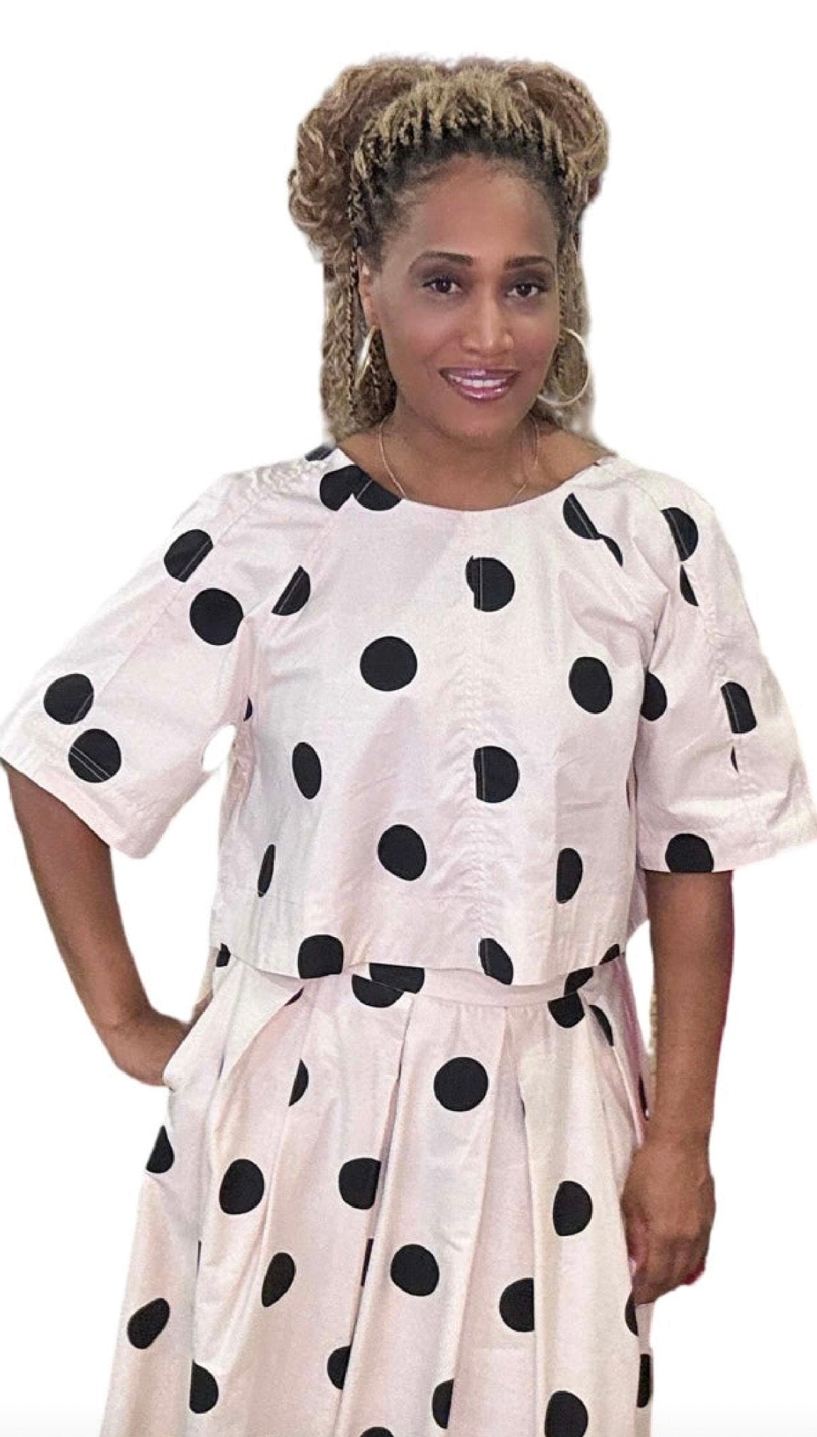 This playful and elegant polka dot top features a boxy silhouette and short sleeves for a relaxed yet polished look. The back is detailed with delicate tie accents, adding a unique and feminine touch. Perfect for pairing with skirts, trousers, or jeans, this top is a versatile addition to your wardrobe, offering both comfort and style for various occasions.
