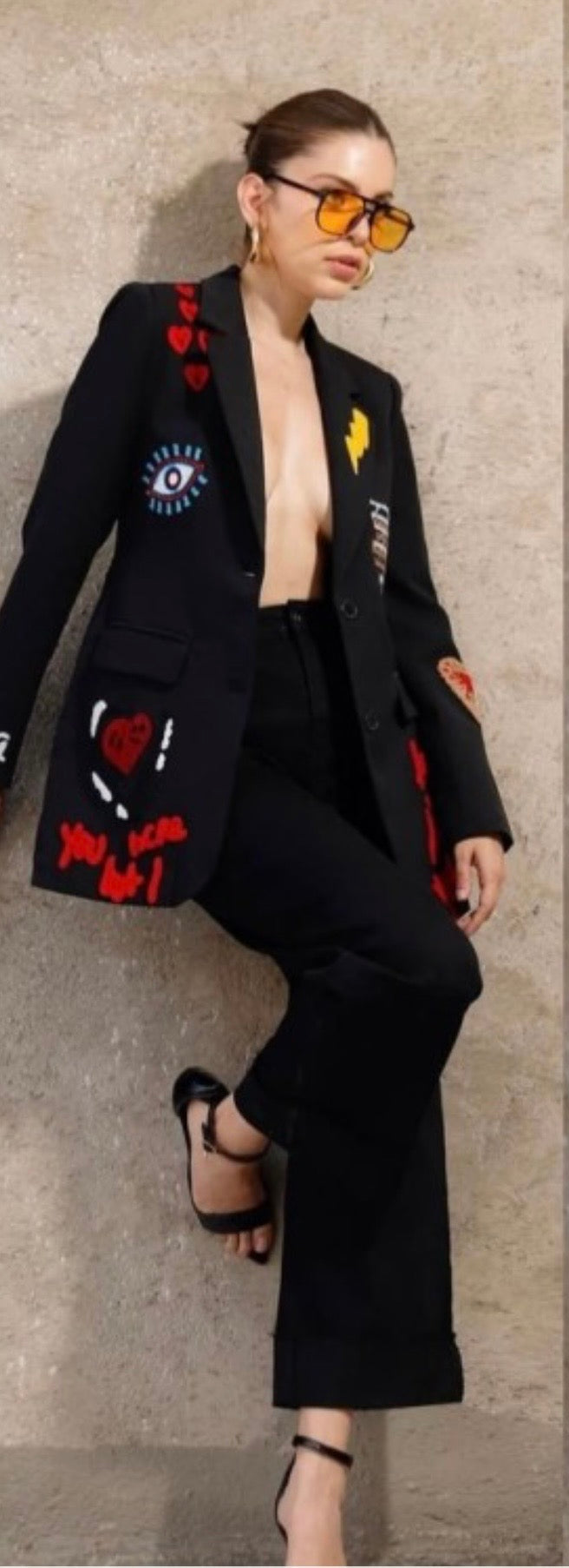 Make a bold impression with our Embroidered Statement Blazer in sleek midnight black. Featuring eye-catching embroidered patches, including a lightning bolt, mystical eye, heart motifs, and artistic script details, this blazer is a wearable piece of art.