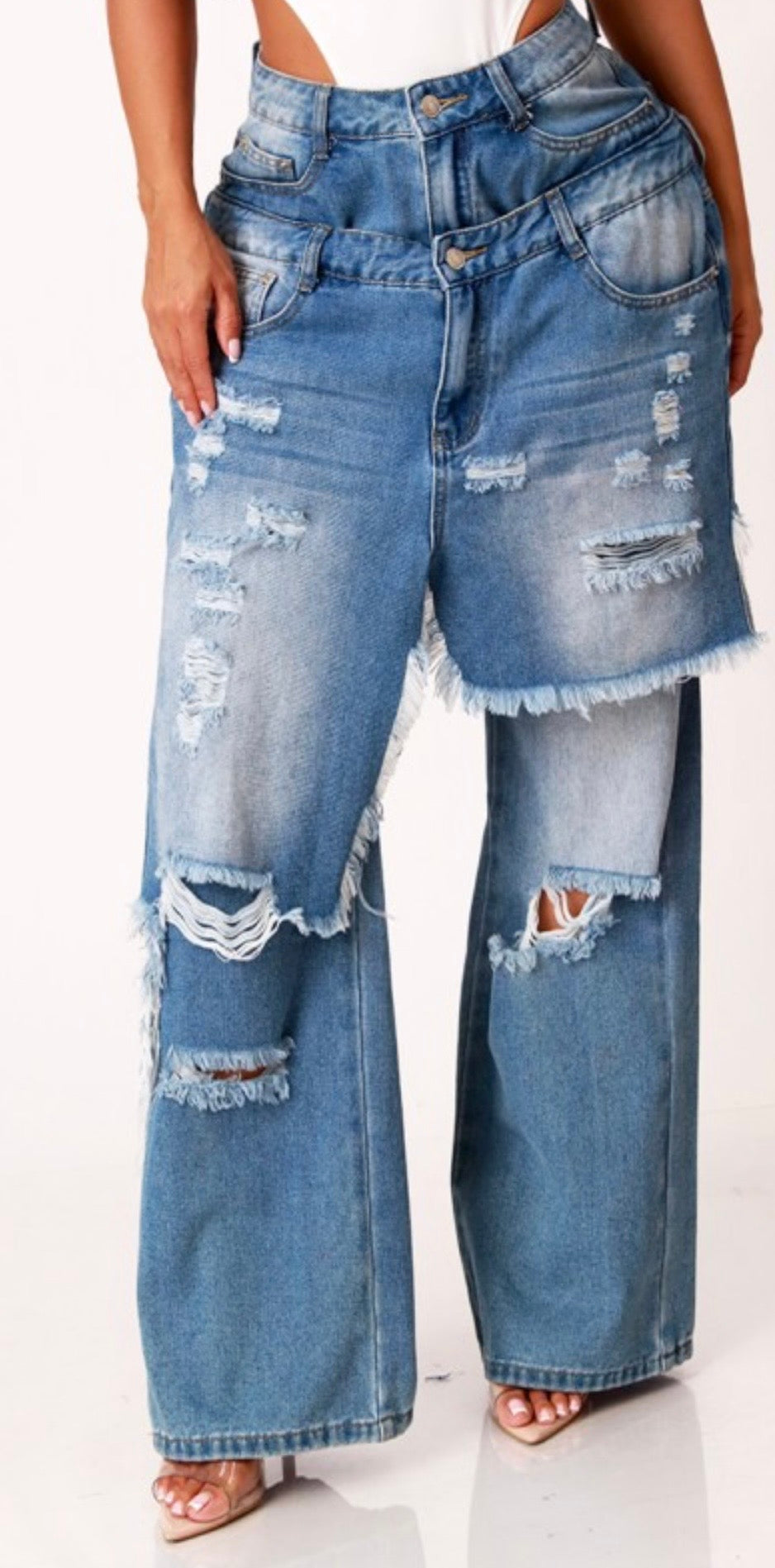 DISTRESSED SKIRT DOUBLE LAYER WIDE LEG DENIM PANTS