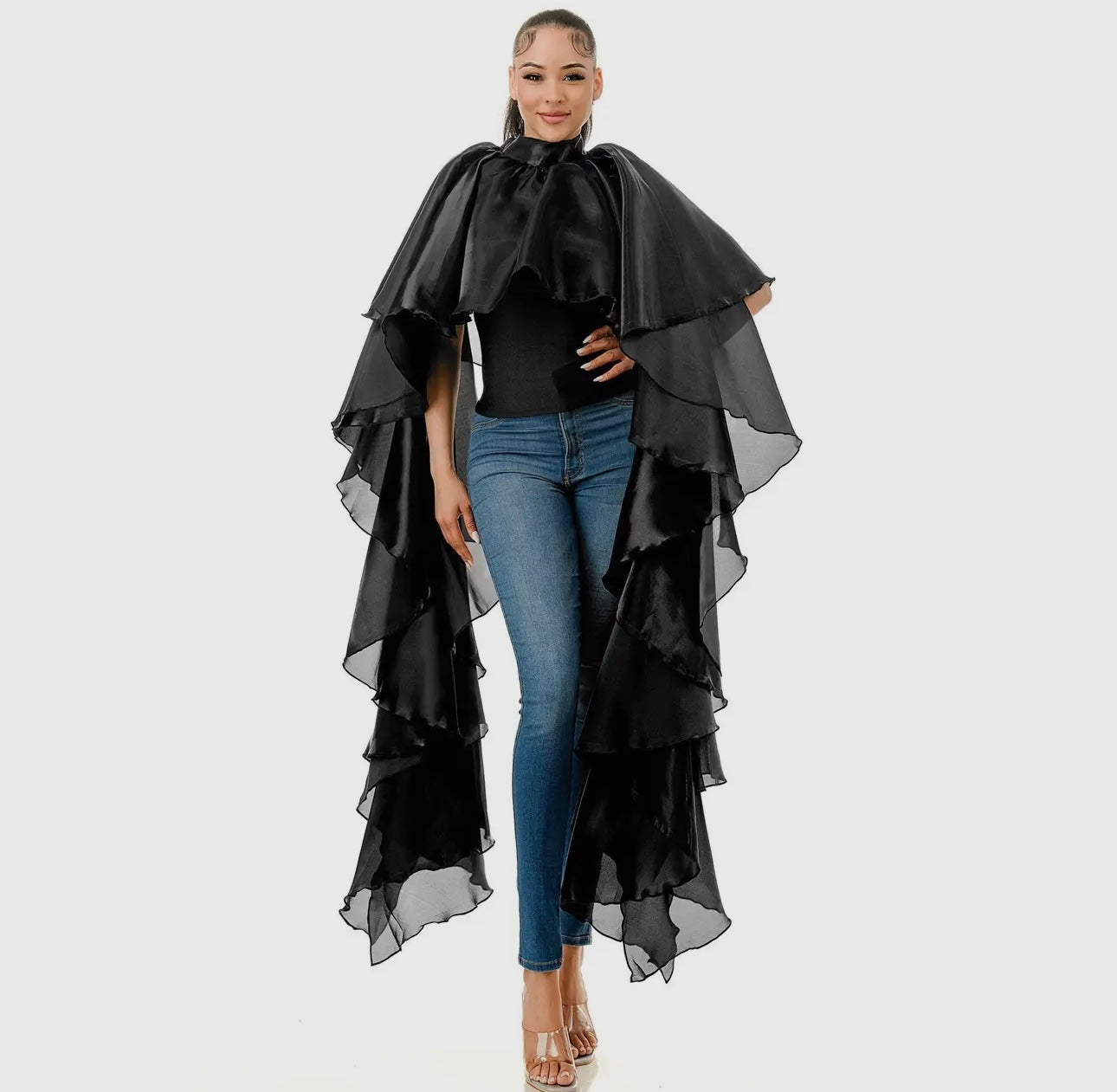 Mock Neck Back Tie Ruffled Extended Long Flare