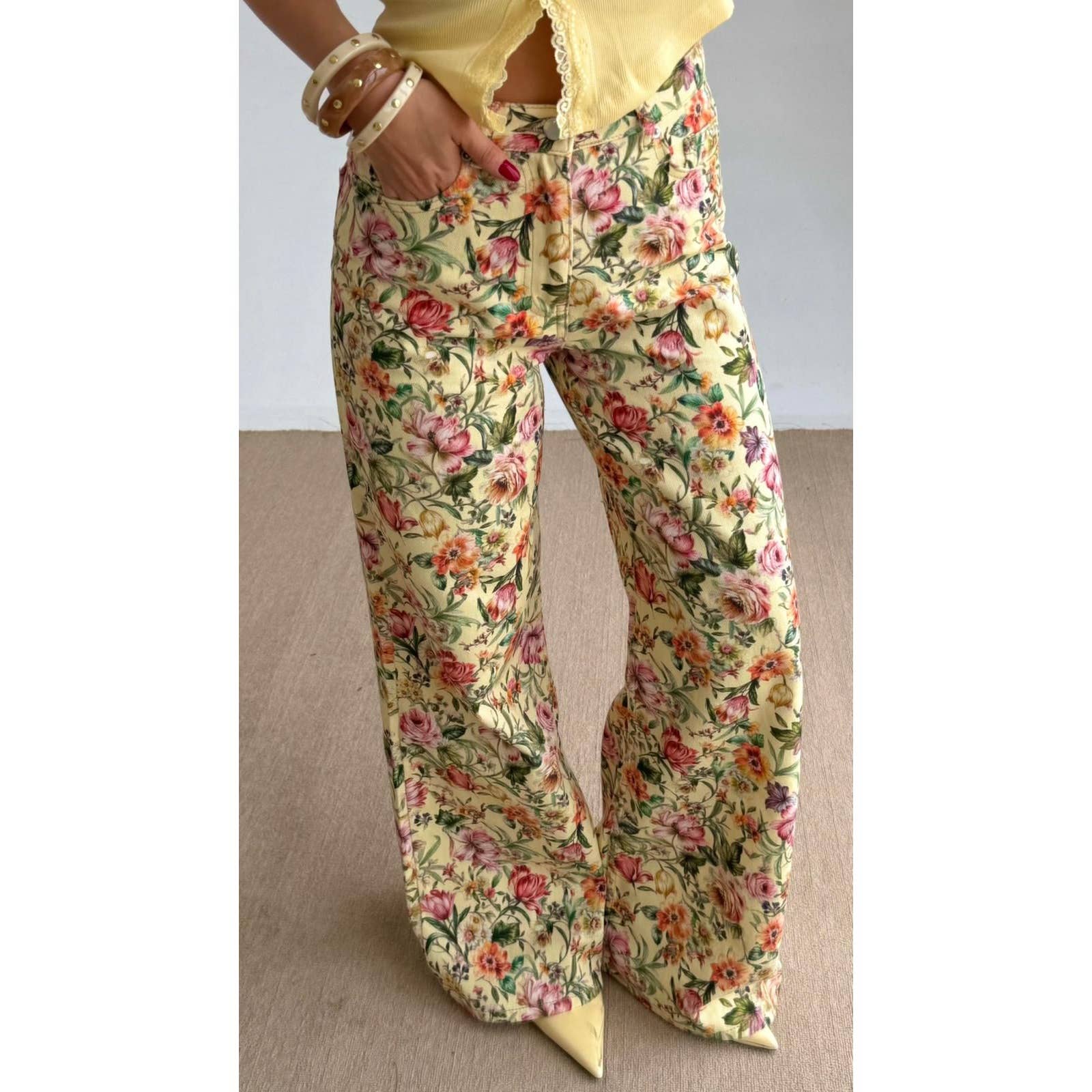 This jeans style features an allover botanical floral print, a wide leg silhouette, and a full length flowing hem. Designed with a high waist, button and zipper closure, and classic five pocket construction, it gives a vintage inspired feminine look that works for statement seasonal styling. The structured printed denim fabric adds polished shape and visual impact, making it a standout choice for brunch, garden parties, or spring weekend outfits.