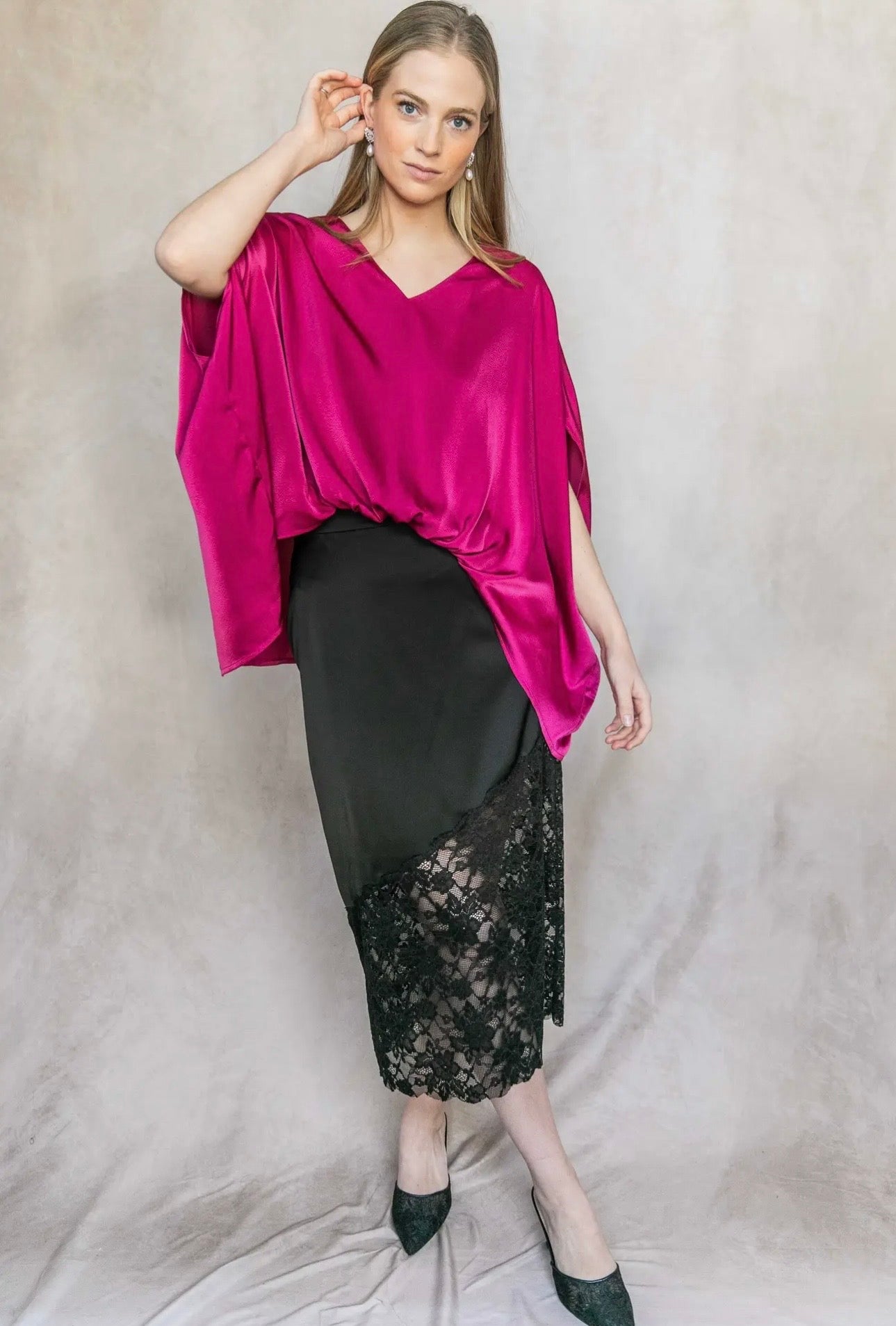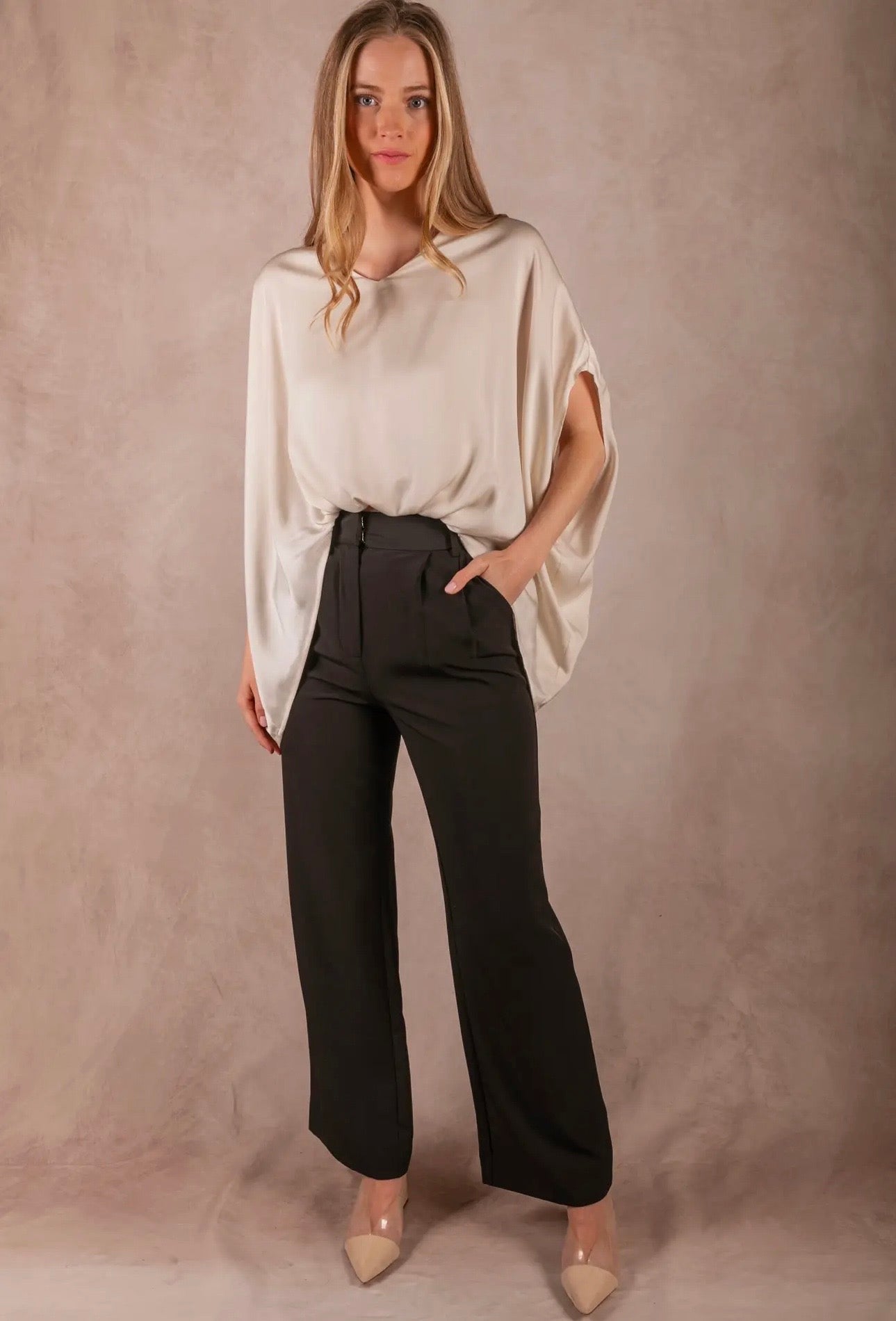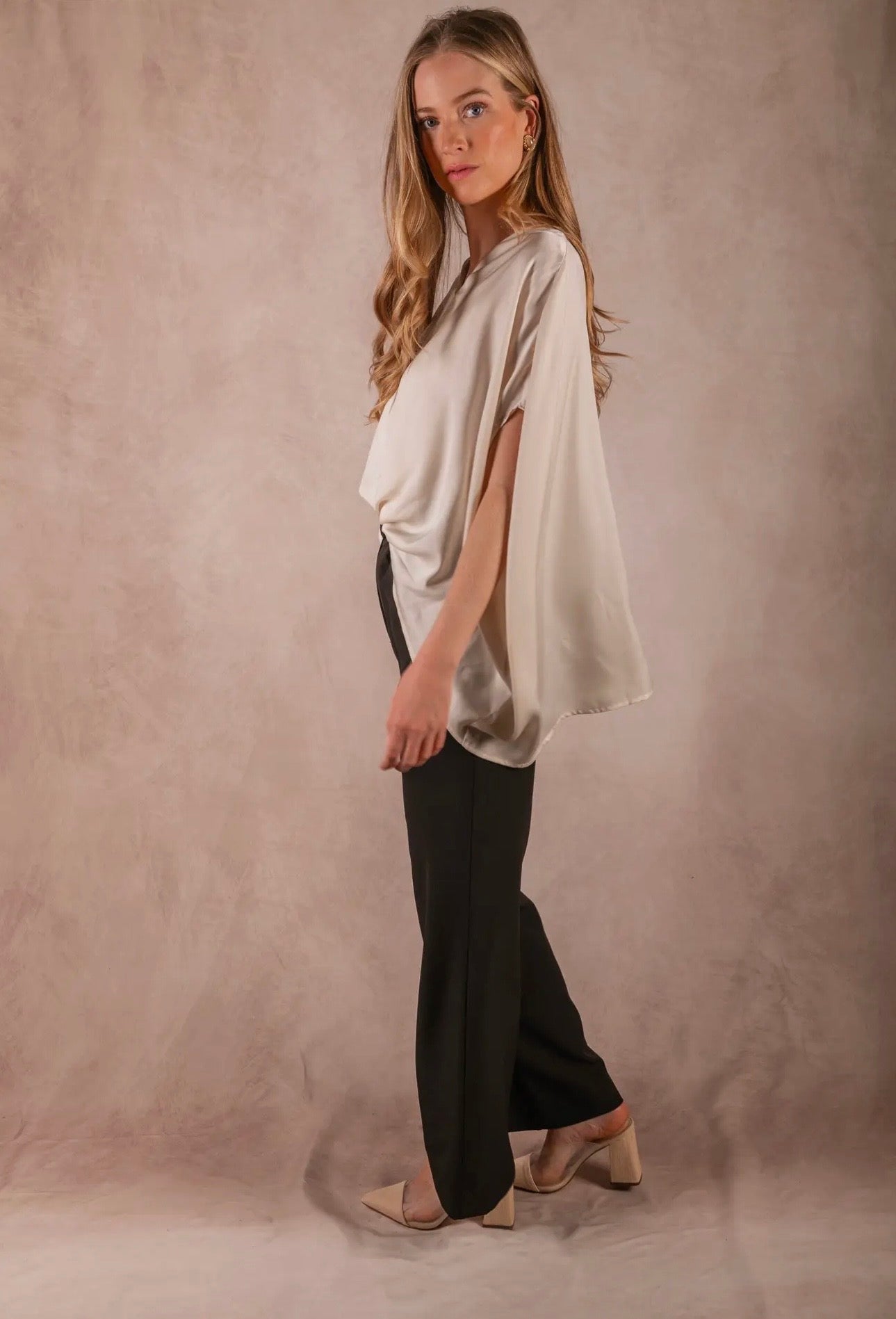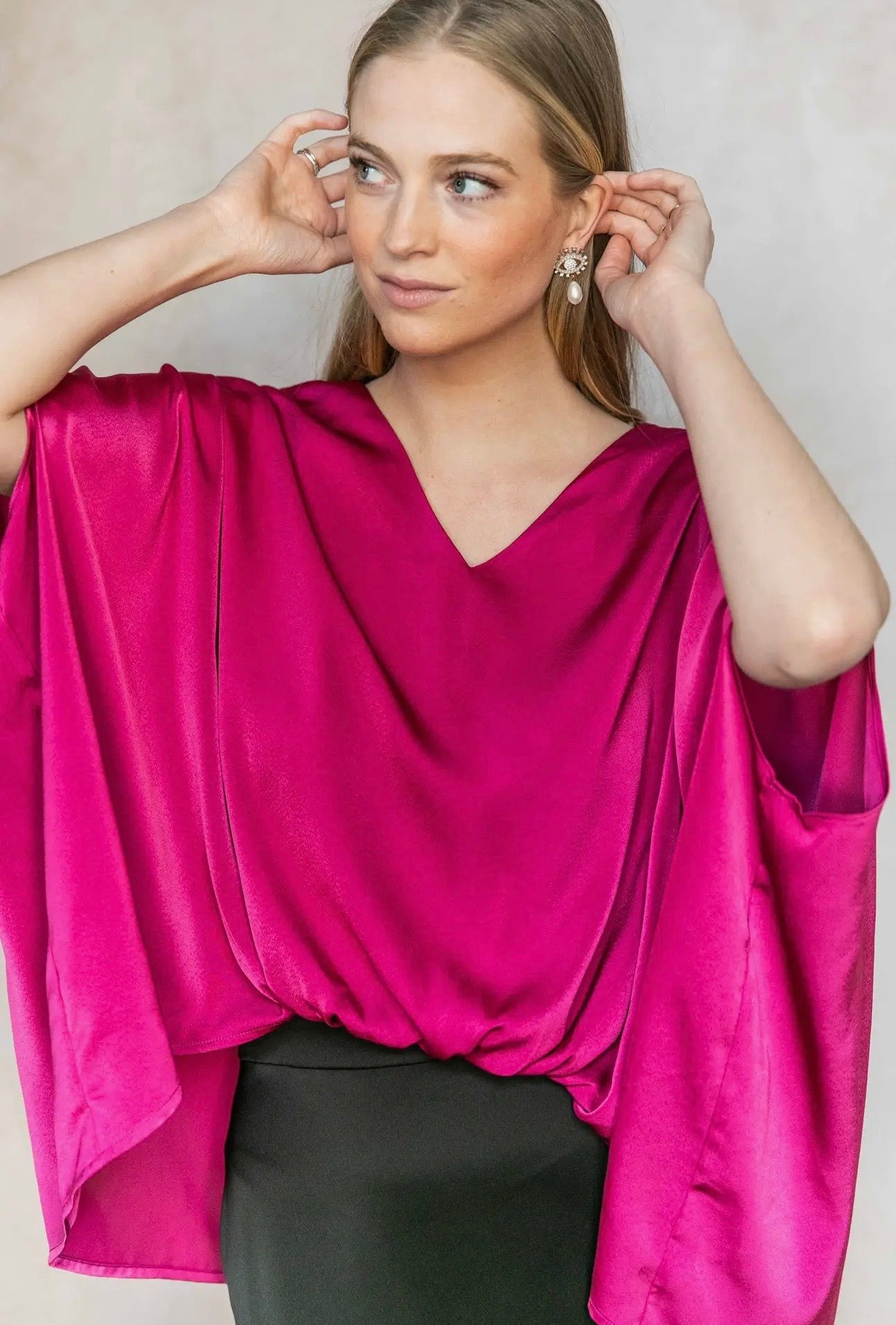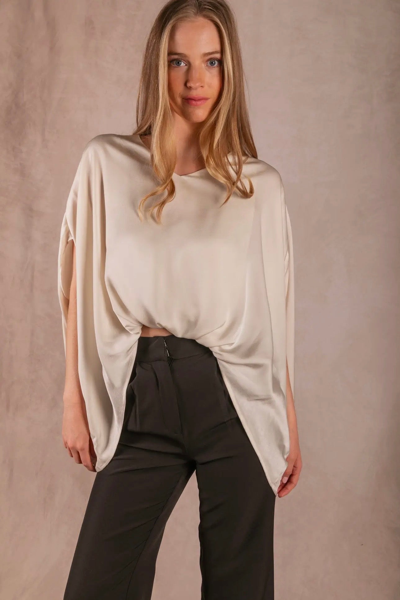 Soft sheen meets effortless shape. This satin top features a flattering V-neckline and an elastic front waist that creates a naturally flowy, feminine silhouette.