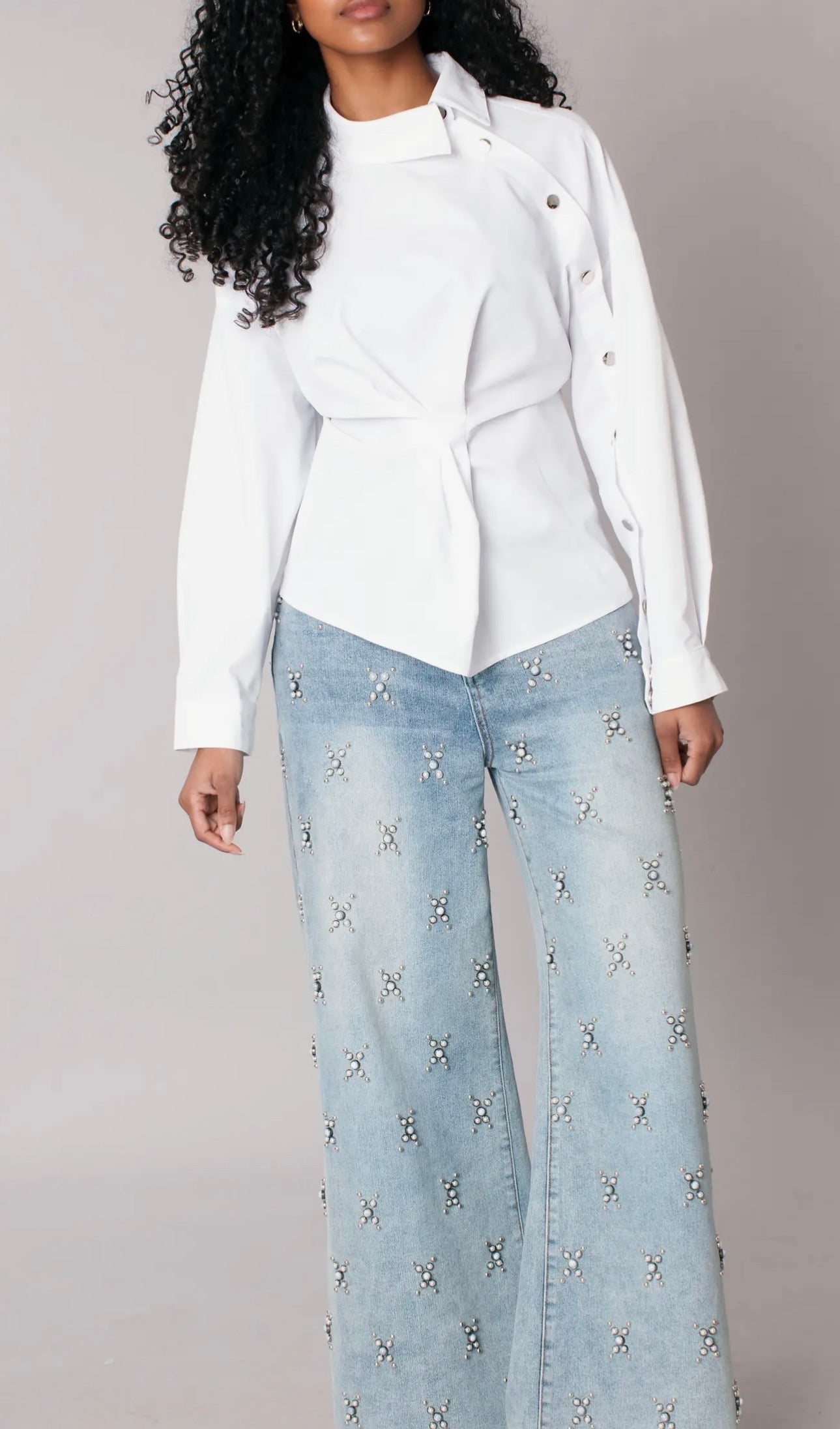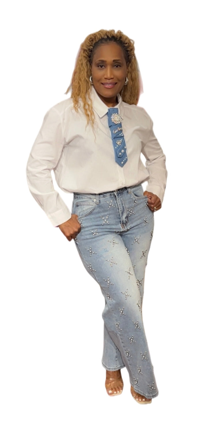 Shine in these trendy jeans for women featuring starburst pearl embellishments and a flattering wide-leg silhouette. These stylish denim jeans for women blend statement detail with effortless comfort for standout boutique outfits.