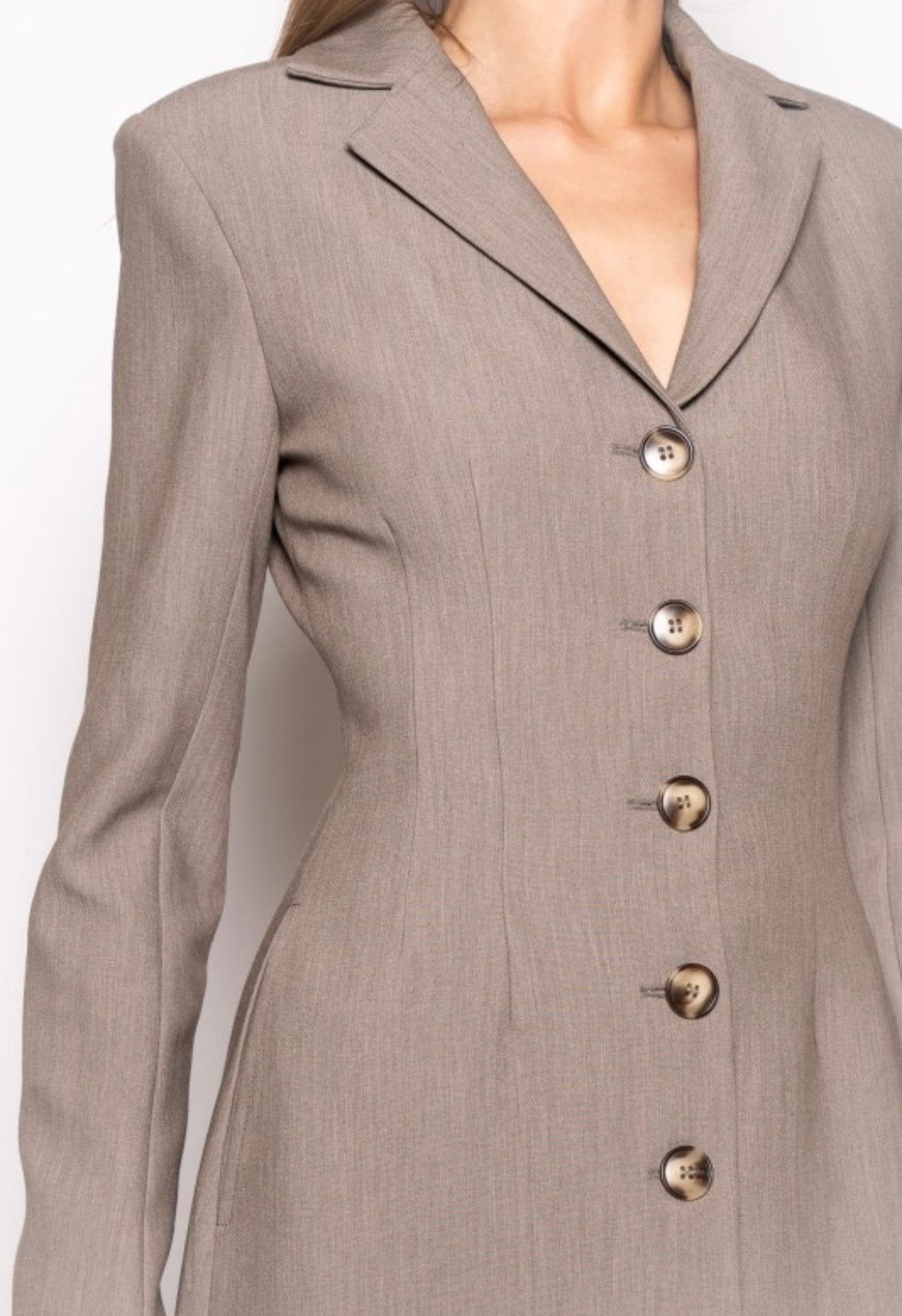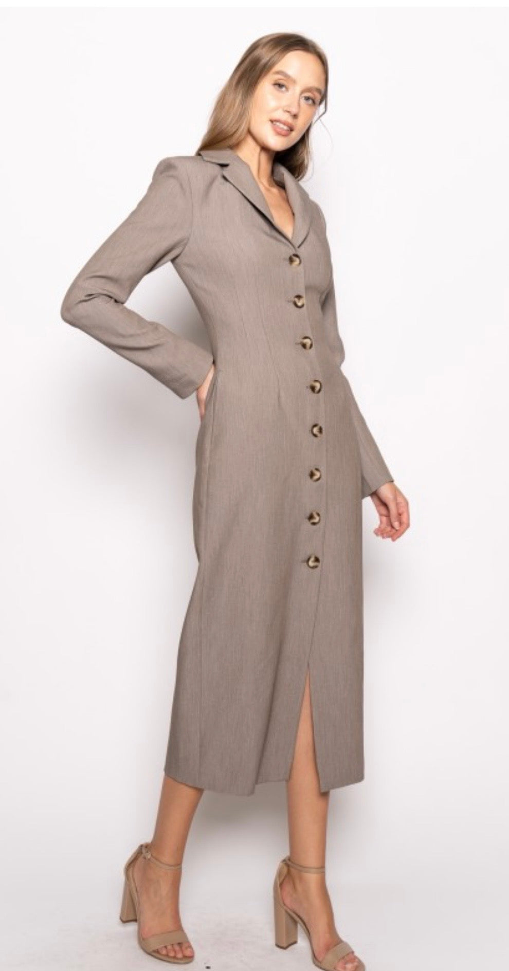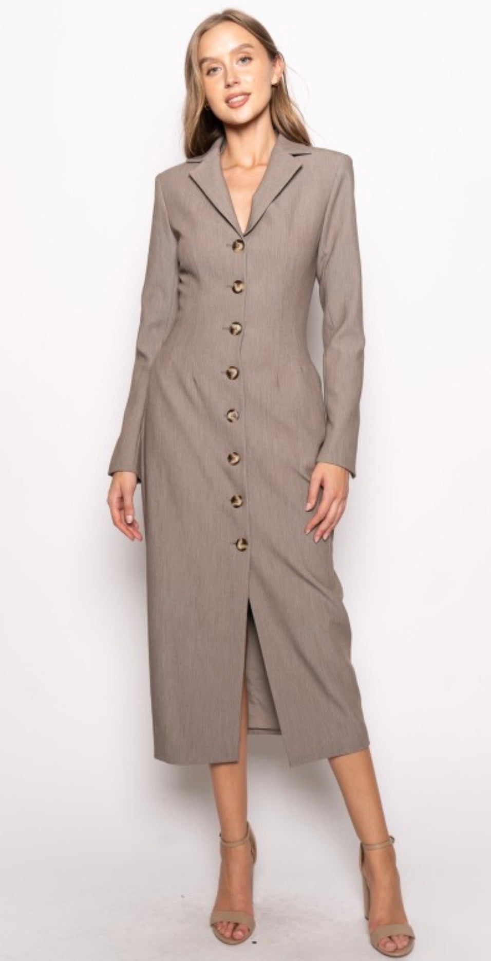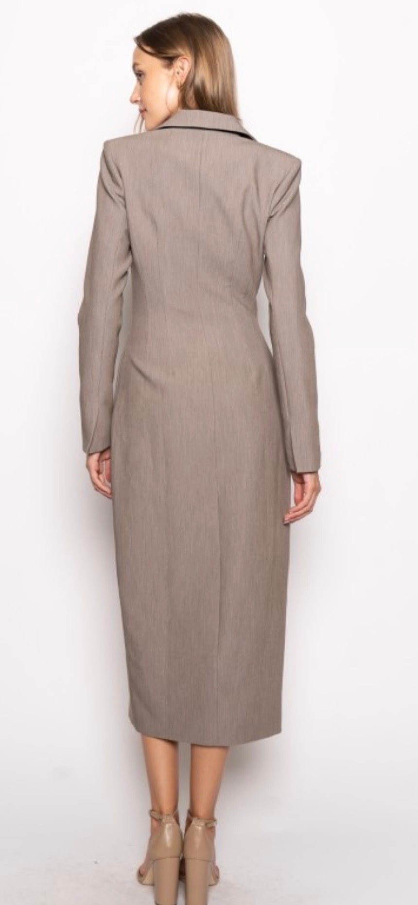 Tailored sophistication meets feminine charm in our Preppy Chic Blazer Midi Suit Dress a timeless silhouette reimagined for the modern woman. Designed with a structured blazer-inspired bodice, notched lapels, and button-front closure, this midi dress offers a sleek, tailored fit that exudes confidence. The waist-defining cut and flowing midi-length skirt create a polished yet effortlessly flattering shape. Crafted from premium suiting fabric, it transitions seamlessly from office to evening, making it perfect for business events, luncheons, or elevated holiday gatherings. Pair it with pumps for a classic power look or with boots for a modern edge