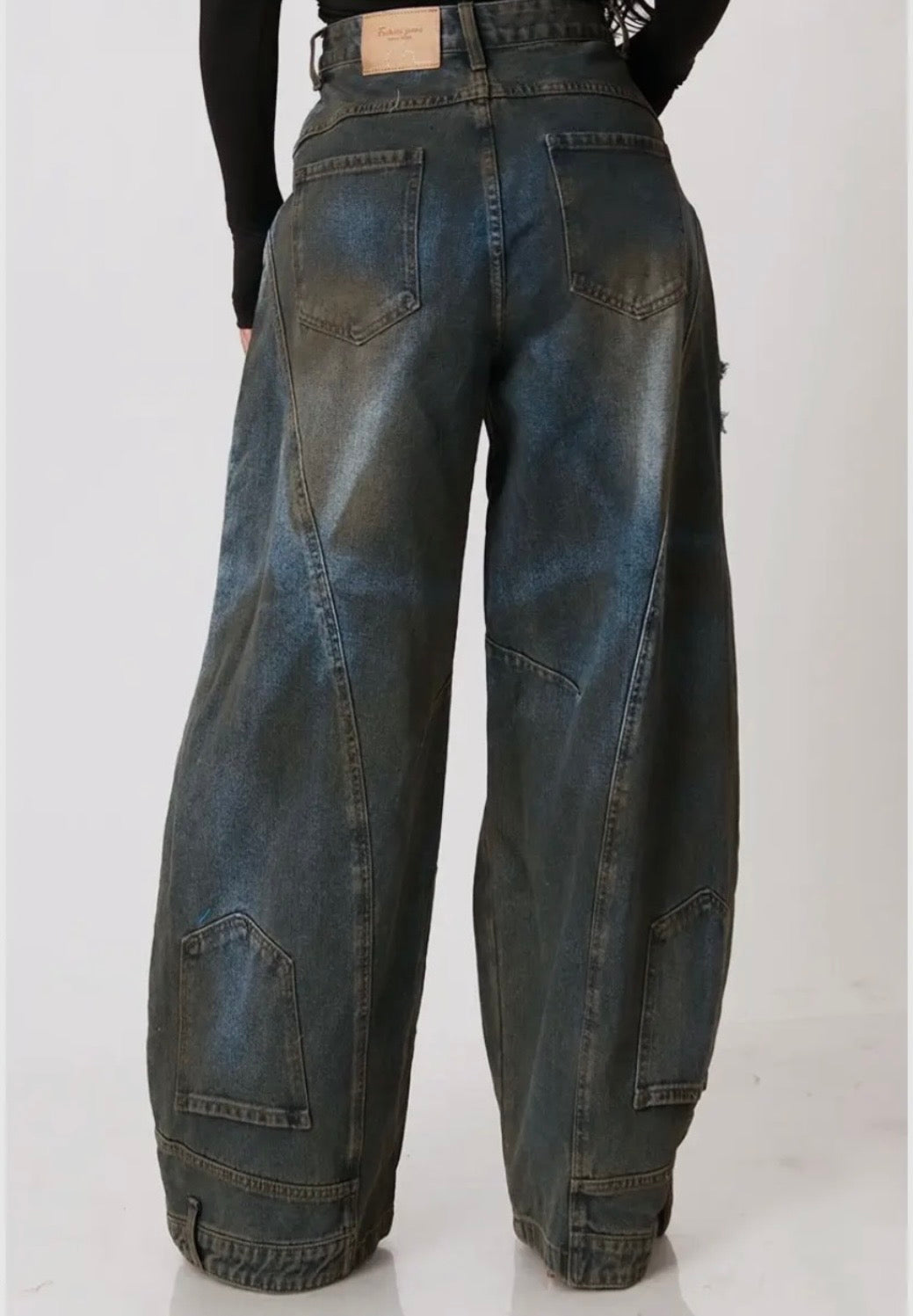 These wide denim pants bring vintage grit with a modern oversized twist. Designed in a loose fit with distressed details and a washed, rugged finish, they capture the essence of lived-in, street-ready style. The exaggerated wide leg silhouette offers both comfort and bold edge, while utility-inspired seam lines and pocket accents elevate the look. Perfect for pairing with sleek tops or casual layers, these jeans make a strong fashion statement.